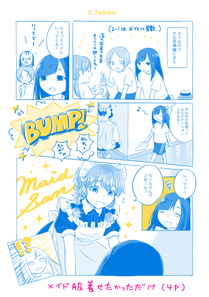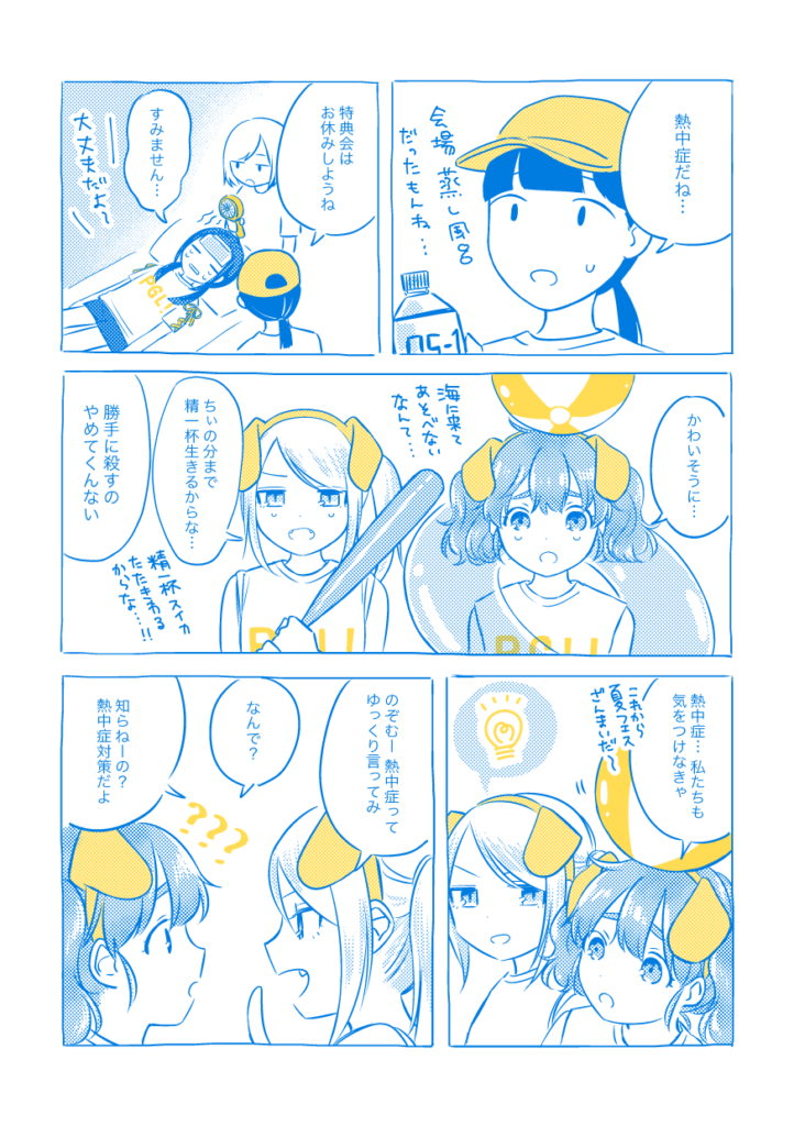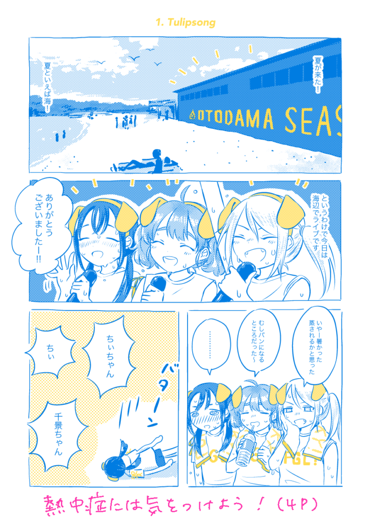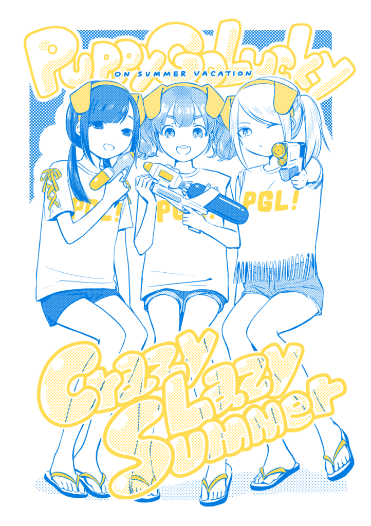 Puppy Go Lucky 夏休み編 “Crazy Lazy Summer” 12P / 本文2色 / 100円 Puppy Go Luckyという3人組女子中学生アイドルが海辺でライブしたり駅で待ち合わせしたり文化祭準備したり、ただひたすら平和に夏を過ごす漫画。4P漫画×3本。現在DL版のみ。 発行: COMITIA129 (2019年8月25日) 通販 (DL) ▼本文サンプル